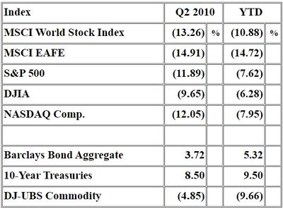 Double Dip, Double Trouble…..Investing in 2010 (just like 2009 and 2008 for that matter) traces an arc not unlike that of many individual lives: the happiness of profits builds slowly and inconsistently, and then the dread of loss comes without warning and all at once. On the dubious premise that nothing improves a bad mood like spreading it around, the recent outburst of negativity in May and June may be making global investors wallow in mutual empathy. The gnawing fear of a double-dip recession has taken the air out a nascent economic recovery and injected investors with a sobering dose of pessimism. Since reaching a year-high peak on April 23rd, the S&P 500 has tumbled into a freefall of 16%, rocked by Europe’s fiscal deterioration, fears of China’s slowing growth and an oil spill in the Gulf of Mexico seemingly resistant to either human or divine intervention. The ensuing panic quickly erased this year’s tentative gains and landed us deeper into bear market territory. Thus Q2 2010 snapped a four-quarter winning streak, with ominous repercussions as we head into the second half of the year. As in 2008, virtually all risk asset categories showed negative returns year to-date while U.S. Treasuries once again bask in the glory of its ultimate safe haven status. The yield on 10-Year Treasuries plunged to a 14-month low of 2.98%. What is the bond market signaling that equity investors don’t know?